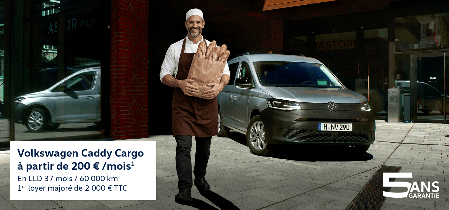 (1) Offre en LLD sur 37 mois / 60000 km, 1er loyer majoré de 2 000 € TTC, suivi de 36 loyers de 200 € HT pour un Caddy CARGO Business TDI 102 BVM6 au prix catalogue de 27650 € HT.